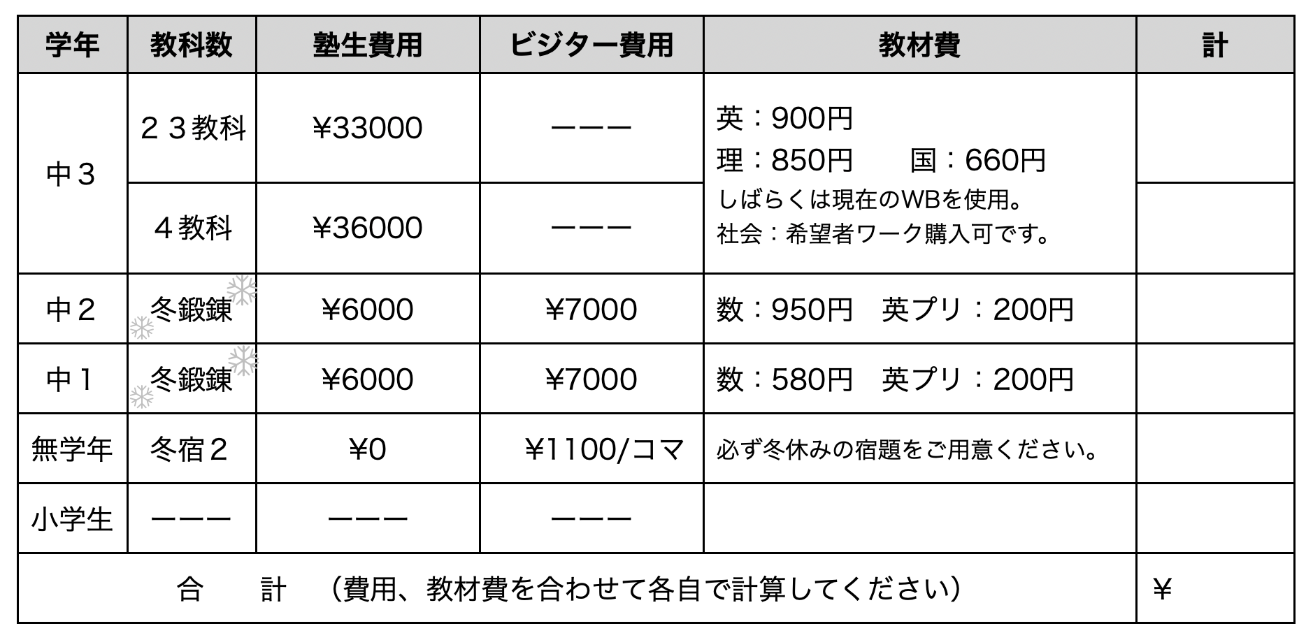 ●「冬宿」のみ参加したい外部生の方は「1コマ¥1100」となります。